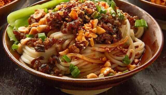 擔擔面是四川成都的傳統面食小吃,[bai]據說(shuō)此名源于挑夫們在街頭挑著(zhù)擔擔賣(mài)面而得。每根面條都充滿(mǎn)爽滑和韌勁,以紅油打底,加上用雞骨豬骨燉煮的高湯,辣子的辛辣把肉燥的香氣發(fā)揮到極致,口感咸香微辣,聞著(zhù)香氣都令人胃口大開(kāi),嘗一口絕對忘不了。